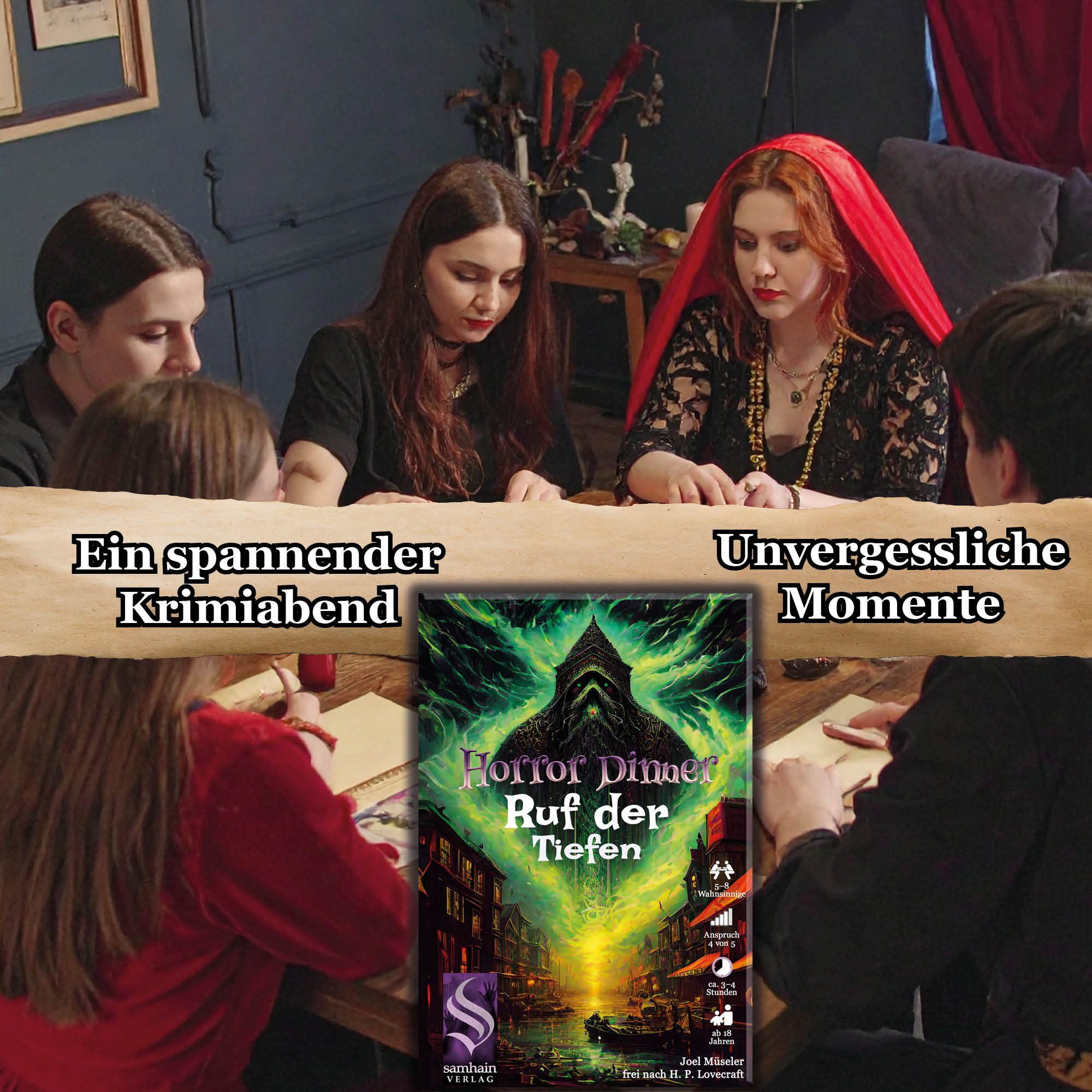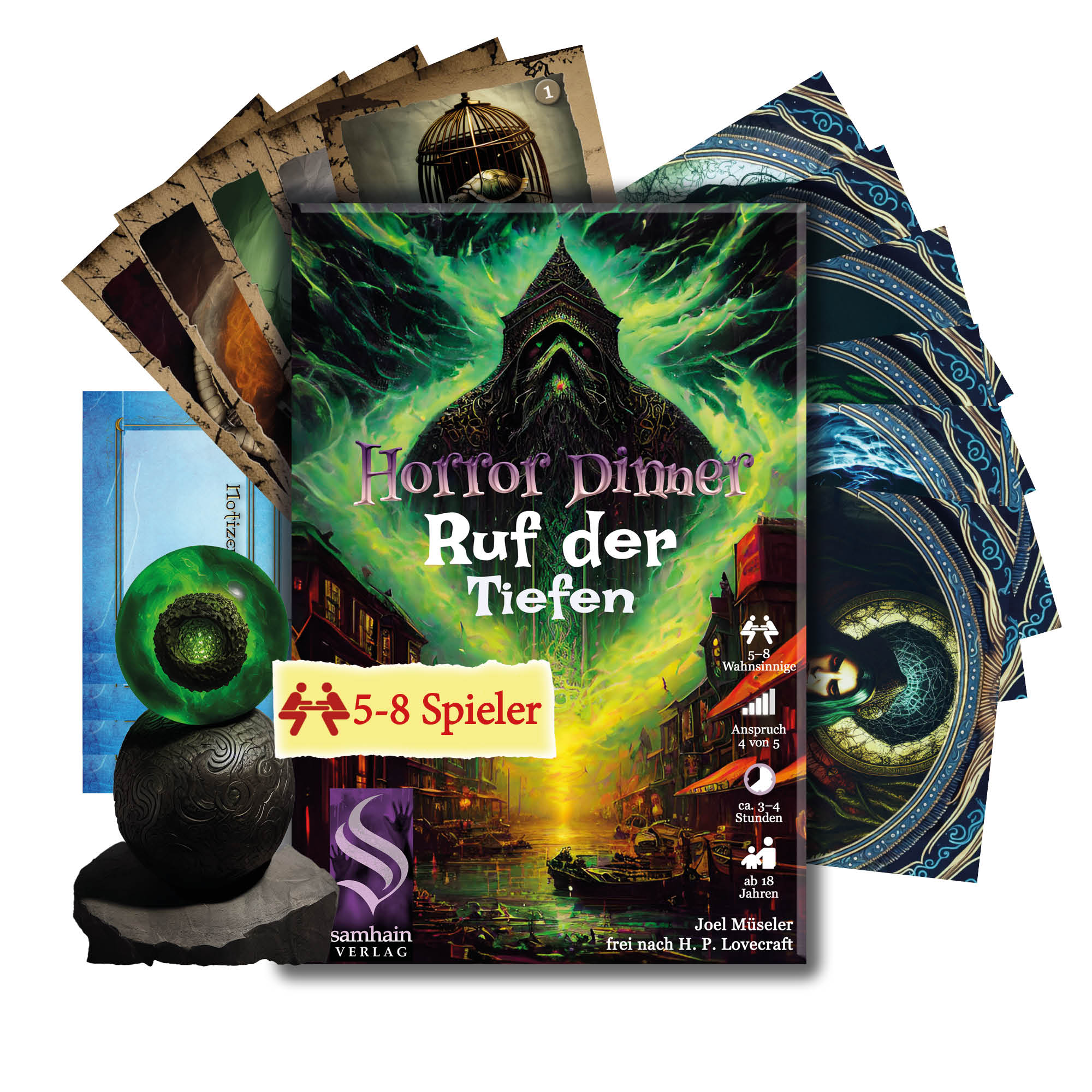 Lass den Wahnsinn hinein. Mache ihn mit deinen Gästen bekannt. Niemand von euch wird das Mahl bei geistiger Gesundheit überstehen! „HORROR DINNER – Der Ruf“ bringt die Albträume aus H. P. Lovecrafts Call of Cthulhu und anderen Schrecken auf den Esstisch!